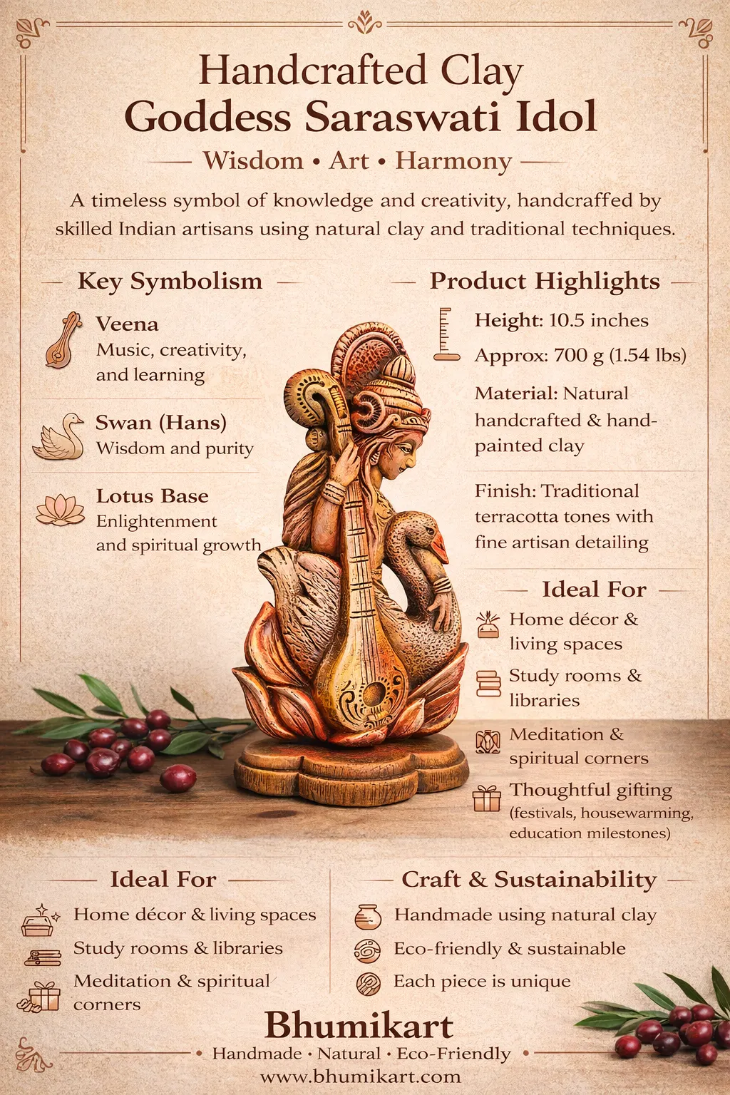 Invite calm, creativity, and timeless beauty into your space with this exquisitely handcrafted clay sculpture inspired by Goddess Saraswati—the universal symbol of knowledge, art, and harmony. Thoughtfully created by skilled Indian artisans, this piece reflects centuries of traditional craftsmanship blended with refined, contemporary appeal.