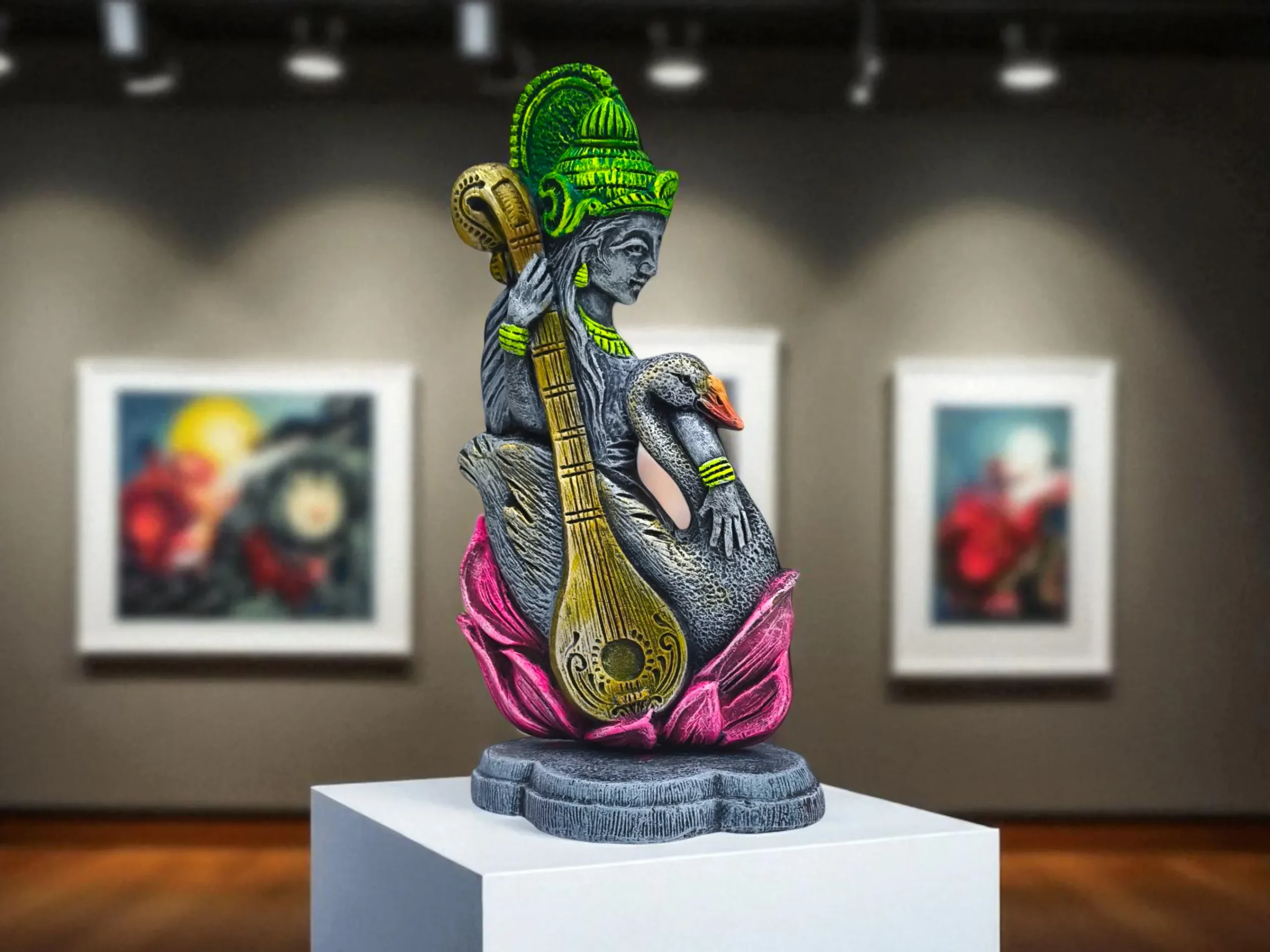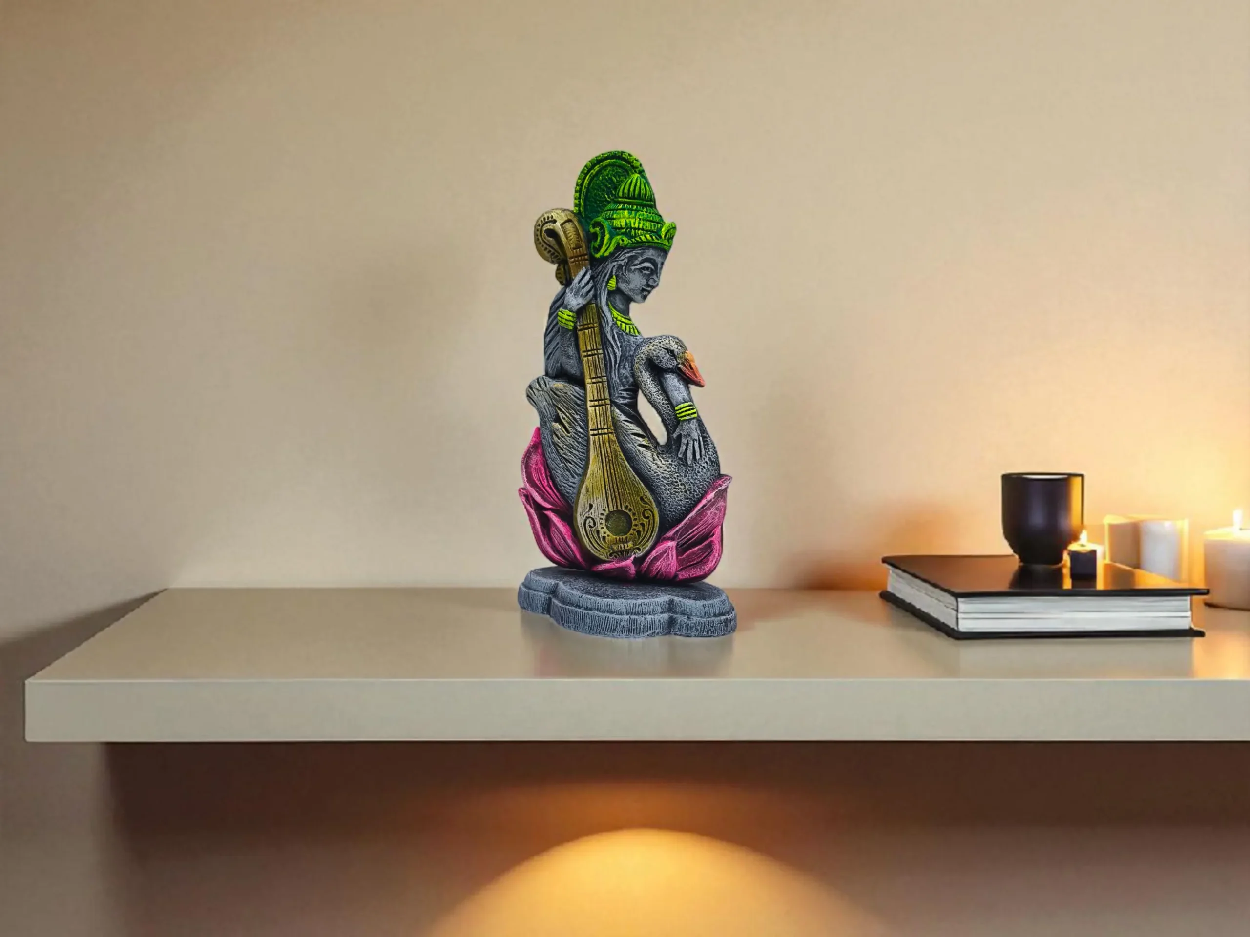 A handcrafted clay Goddess Saraswati sculpture featuring the veena and swan, finished with contemporary hand-painted accents. A harmonious blend of tradition and modern design, perfect for refined home décor, creative spaces, and meaningful gifting.