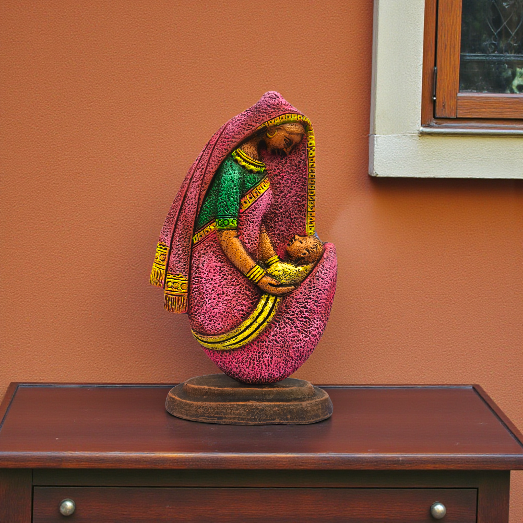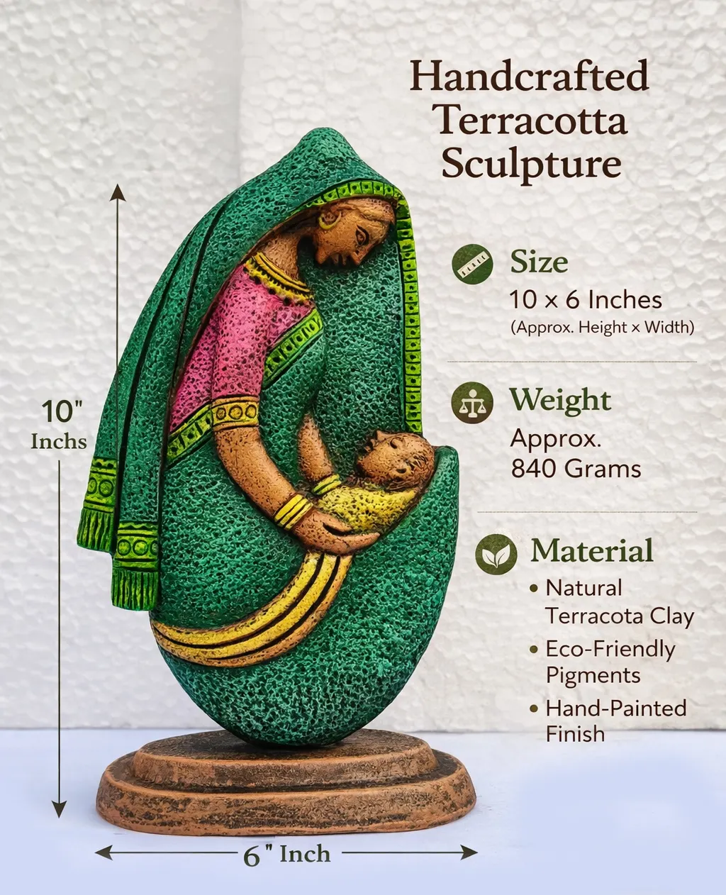 Lovingly created by skilled rural artisans, each sculpture is shaped entirely by hand using natural terracotta clay. The clay is carefully molded, slow-dried, and kiln-fired to achieve strength and durability. Once fired, the piece is hand-painted using eco-friendly, non-toxic pigments, giving it a rich, earthy texture and vibrant yet balanced colors.