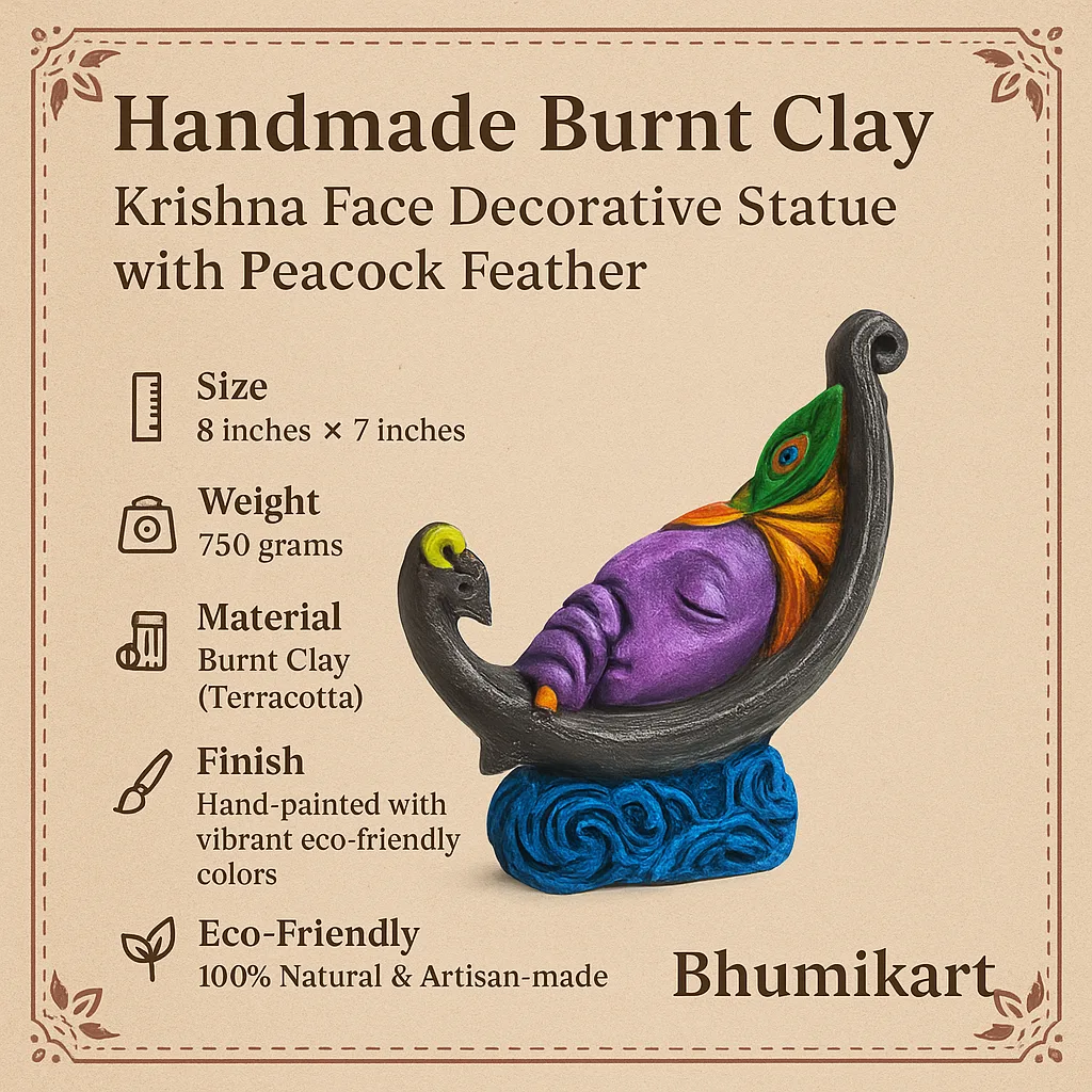 Bring home a touch of timeless Indian artistry with this Handmade Clay Krishna Face Statue with Peacock Feather. Crafted by skilled artisans using natural burnt clay, this piece beautifully captures the serene expression of Lord Krishna, adorned with a vibrant peacock feather symbolizing beauty and divinity.